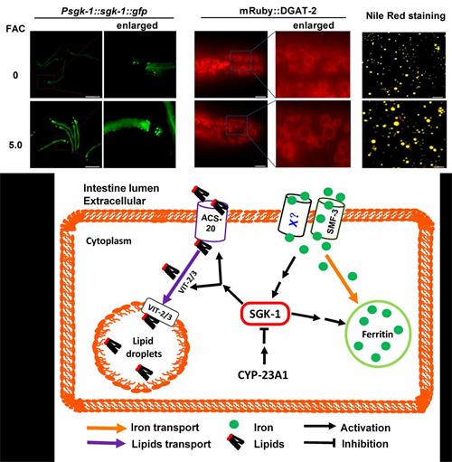 模式生物秀丽线虫(C. elegans)生活周期短,易于开展大规模遗传筛选,其铁代谢途径和脂类代谢非常保守途径(Zhang et al, BMC Genomics,2013)。梁斌课题组的研究生王海臻和姜雪等研究发现,和哺乳动物一样,铁过载导致秀丽线虫铁蛋白表达上升、脂肪含量增加;随后他们发现,铁过载诱导血清及糖皮质激素诱导激酶(Serum and glucocorticoid inducible kinase, sgk-1)的mRNA和蛋白的表达;相反,降低铁含量抑制SGK-1的表达。SGK-1上调脂肪酸转运蛋白(FATP)的同源基因(ACS-20)的表达,增加肠道从食物中摄取更多脂类,进而通过脂滴蛋白 VIT-2/3将吸收的脂类转运到脂滴中储存起来,导致秀丽线虫肥胖。他们同时还发现,细胞色素 P450 家族的CYP-23A1 起到了平衡脂肪代谢与铁代谢的作用,敲除 cyp-23A1 导致线虫对铁过载更加敏感,但该效应也依赖于SGK-1。该研究表明,血清及糖皮质激素诱导激酶SGK-1是一个新的协同调控铁代谢和脂代谢的核心基因,由于SGK-1敲除的小鼠无其它明显表型,SGK-1有望作为治疗铁过载导致的肥胖和肥胖相关代谢性疾病的潜在靶标。