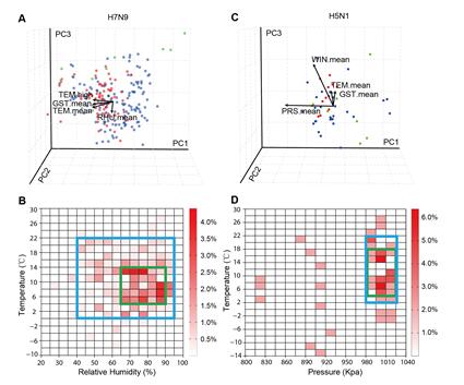 H5N1和H7N9通过PCA分析的预测结果结果表明,流感病毒爆发和传播与温度、湿度等气候因子相关。时空分析发现,H5N1感染病例主要集中在华南、中部以及西北地区,而H7N9的感染病例主要集中在东部和南部沿海地区。H5N1流感病毒感染主要集中在12月、1月和2月三个月份,而H7N9无明显月份分布差异。除了时空特性的差异,两种病毒的适宜气候因子也不相同。H5N1感染的适宜温度为5-10℃,风速1-2 km/h;而H7N9的适宜温度为10-15℃;风速2-3 km/h;另外两株病毒对应的适宜湿度均为60-80%。通过整合气候因子对人类感染两株高致病禽流感病毒的分析,对于预测可能爆发的疫情和制定预防措施提供了有利依据。该研究拓展了对气候变化与人类疾病关联规律的基本认识,明确气候因子影响人类疾病的阈值,揭示气候变化影响传染性疾病的动态时空传播和进化机制。该研究将进一步探索气候变化直接、间接影响典型传染性疾病的突发性,并揭示气候变化影响传染性疾病的传播机制。这些结果已于2015年12月11日在Scientific Reports 发表,题为Identification of climate factors related to human infection with avian influenza A H7N9 and H5N1 viruses in China。该研究得到了刘起勇主持的全球变化国家重大科学研究计划(“973”计划)(项目名称:气候变化对人类健康的影响与适应机制研究、项目编号:2012CB955500)、国家自然科学基金项目及“十二五”传染病专项能力建设项目的资助。