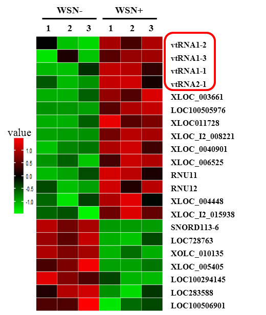 图1:流感病毒感染后vtRNA家族表达上调(芯片检测) 陈吉龙领导的研究组通过cDNA芯片等分析发现,流感病毒感染显着上调了宿主细胞内vtRNA家族的表达水平(图1)。 进一步通过一系列实验,在流感病毒感染的A549细胞和小鼠肺组织中分别证实了病毒NS1蛋白诱导了vtRNA的高表达。深入的功能研究发现,宿主细胞中vtRNA的表达水平对病毒复制有深刻影响,当vtRNA表达受到人为敲低后,流感病毒的复制能力显着下降,反之,外源过表达vtRNA能够促进流感病毒的复制。该研究通过小鼠模型攻毒实验进一步证实了vtRNA对病毒复制的促进作用。
