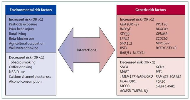 高龄、种族、男性等是 PD 的危险因素,其他危险因素包括各种环境因素的暴露(见图 1)。近期一项 meta 分析明确了 11 种与 PD 相关的环境因素,包括杀虫剂暴露、既往头颅外伤、农村居住、β受体阻滞剂使用、农民职业、饮用井水等。与 PD 风险降低相关的因素包括吸烟、饮用咖啡、NSAIDs 药物使用、钙离子通道阻滞剂使用以及饮酒等。