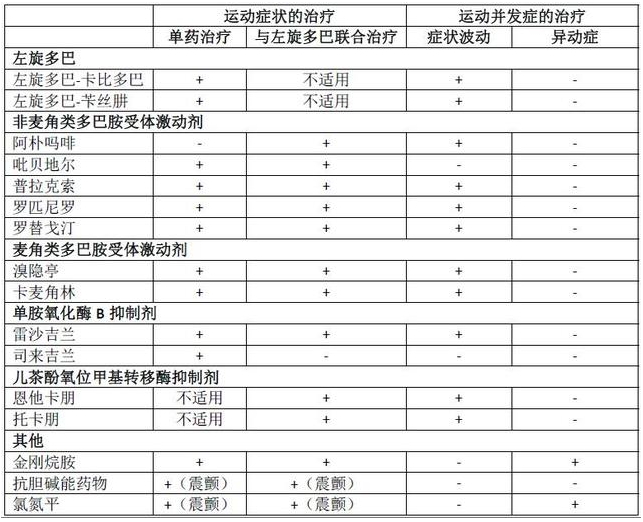 增强脑内多巴胺浓度或刺激多巴胺能受体的药物是运动症状的主要治疗方法(表 2)。在决定开始何种初始治疗时需要考虑药物的不良反应。多巴胺受体激动剂(DA)和左旋多巴均可能出现恶心、日间嗜睡、水肿等,DA 更明显。多巴胺受体激动剂可能出现的其他不良反应包括冲动控制障碍、幻觉等。