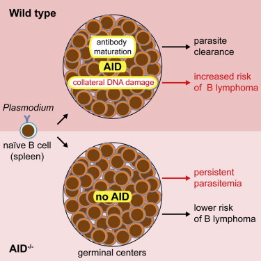 洛克菲勒大学的Davide Robbiani及同事们决定,通过在小鼠中研究疟疾感染来解决这一问题。他们发现在长期对疟疾的免疫应答过程中,B淋巴细胞广泛增殖,一种叫做活化诱导胞苷脱氨酶(AID)的蛋白长时间表达。通常情况下,AID能够突变抗体基因DNA来促进DNA洗牌,从而生成各种各样对于抗击感染至关重要的抗体。然而,Robbiani研究小组发现在疟疾感染B淋巴细胞中,AID转而造成了广泛的严重破坏,使得其他基因的DNA发生重排,其中一些基因与癌症形成有关联。