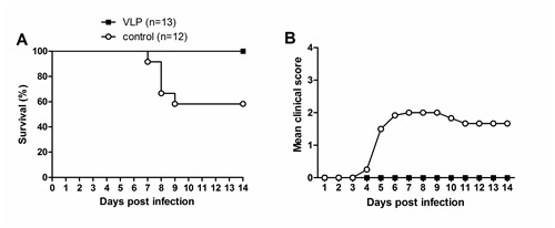 VLPs的母源免疫能保护新生小鼠抵抗EV71病毒的口服感染。(A)存活率,(B)临床症状。