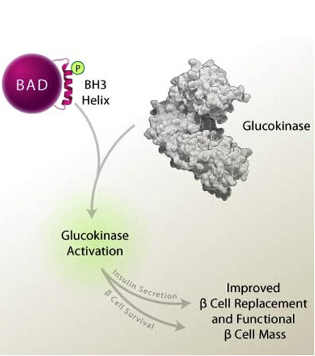 文章指出,促进β细胞存活并维持β细胞产生胰岛素应答葡萄糖刺激能够大大增加β细胞替代疗法治疗I型糖尿病的效果。研究人员发现磷酸化BAD-BH3结构域类似物能够有效促进β细胞在受到应激刺激时产生自我保护效应的能力,同时将这些发现用于改进供体胰岛细胞移植,能够促进糖尿病模型小鼠中β细胞在移植胰岛中的存活,重建胰岛素合成释放能力,并能够改善小鼠糖尿病状态。对机制进行研究发现,β细胞在这种背景下的存活不仅是因为磷酸化BAD失去了对促细胞存活蛋白BCL-2的抑制功能,同时,磷酸化BAD还能够刺激葡糖激酶的激活。