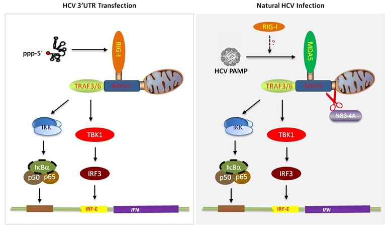 2014年11月21日,国际学术期刊Journal of Hepatology在线发表了中科院上海巴斯德研究所病毒性肝炎研究组的研究论文“MDA5 Plays a Critical Role in Interferon Response during Hepatitis C Virus Infection”。 丙型肝炎病毒(HCV)是人类的重要病原体,能够通过逃逸宿主的免疫防御系统来建立持续性感染,导致肝硬化和肝癌。病毒在感染过程中被宿主细胞的模式识别受体识别,从而激活固有免疫系统产生抗病毒反应。研究表明RIG-I样受体解旋酶家族中的宿主蛋白RIG-I在肝细胞中转染HCV基因组的3’UTR RNA可以被RIG-I识别并激活干扰素的表达,是HCV的模式识别受体,但该现象从未在HCV病毒感染过程中证明过。由于HCV编码的NS3-4A蛋白酶可以切割RIG-I介导的固有免疫信号通路中关键的衔接蛋白MAVS来逃逸宿主固有免疫反应, HCV感染肝细胞系并不能诱导明显的干扰素表达,因此在HCV病毒天然感染过程中,尚无法研究宿主的固有免疫系统如何去识别HCV,从而启动干扰素表达等一系列的固有免疫反应。 上海巴斯德研究所病毒性肝炎研究组博士研究生曹学智、丁强等在钟劲研究员的指导下,通过表达突变型的MAVS蛋白,构建了HCV病毒感染可诱导固有免疫反应的新型细胞系,发现RIG-I并不是HCV病毒感染过程中的关键模式识别受体。通过基因敲除、生化及功能实验,发现RIG-I样受体解旋酶家族的另一个成员MDA5是识别HCV病毒感染诱导固有免疫反应的关键病原体模式识别受体。该项研究发现了HCV感染过程中真正的模式识别受体,为探讨宿主如何识别HCV来启动固有免疫应答提供了新的研究模型,为最终揭示HCV逃逸宿主的免疫防御系统来建立持续性感染的分子机制奠定了重要基础。 该项研究得到国家自然科学基金和国家传染病重大专项等项目的经费支持。 文章链接:http://www.ncbi.nlm.nih.gov/pubmed/25463548