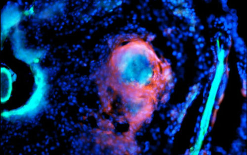 由于在成年期出现条纹前斑马鱼都是透明的,Oehlers可以用不同颜色的荧光标记来标记出细菌、免疫细胞和血管,然后随时间追踪结核感染。当他用亮蓝色的海鱼分枝杆菌来感染斑马鱼时,他看到亮红色的免疫细胞很快包围细菌形成了紧密组织化的肉芽肿。在数天内,在这些小细胞球内部和周围就可看到萌芽的亮绿色血管。他们发现这些新血管是一些功能性的血管,以与正常血管相同的方式运送红细胞。