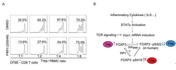 图: PIM1激酶通过催化FOXP3蛋白Serine 422位点磷酸化负向调节Treg细胞免疫抑制活性 A. PIM1抑制剂增强Treg细胞对CD8+T细胞增值的抑制活性;B. PIM1激酶调节Treg免疫抑制活性的分子机制模式图。