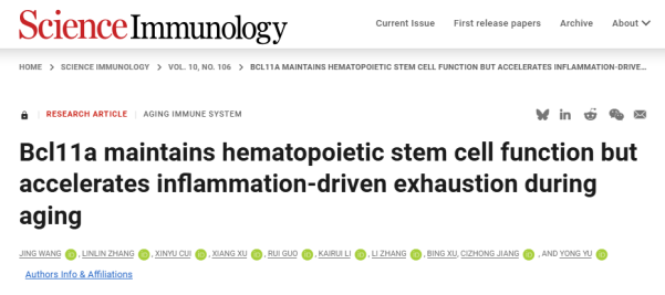 Jing Wang et al. ,Bcl11a maintains hematopoietic stem cell function but accelerates inflammation-driven exhaustion during aging.Sci. Immunol.10,eadr2041(2025).DOI:10.1126/sciimmunol.adr2041