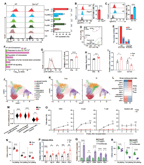 通过转录组学和表观基因组学分析,研究人员发现 Bcl11a 过表达 HSC 中与静息相关的基因表达增加,而与细胞激活和分裂相关的基因表达降低。此外,Bcl11a 还直接结合并抑制 Fcer1g 的表达。Fcer1g是多种Fc受体的共同亚基,其信号通路激活会导致HSCs的激活和分化,损害其自我更新能力。Bcl11a过表达HSCs中Fcer1g的表达水平降低,Bcl11a 通过抑制 Fcer1g 信号传导来维持 HSC 功能。