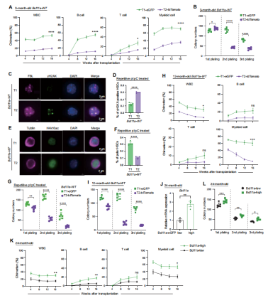 在嵌合小鼠模型中,野生型HSCs(T2-tdTomato)在Bcl11a过表达的环境下表现出更强的激活和分化倾向,导致重建和自我更新能力下降。炎症刺激和衰老过程进一步加剧了这种效应。这些结果表明,Bcl11a 过表达在非细胞自主地促进 HSC 衰老中发挥作用。