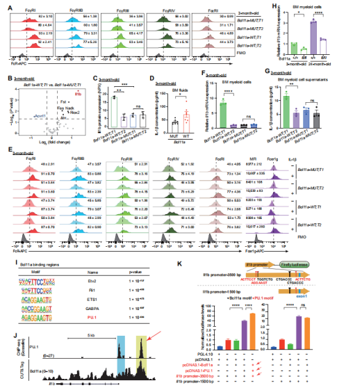 Bcl11a过表达HSCs的骨髓中,IL-1β的产生增加,而IL-1β是骨髓炎症微环境的关键介质。Bcl11a 还与 PU.1 协同作用,PU.1 是 Il1b 的已知正调节因子,从而增强 Il1b 的表达。IL-1β刺激导致野生型HSCs中FcR和Fcer1g的表达增加,从而加剧了Fcer1g信号通路,导致HSCs的分化。