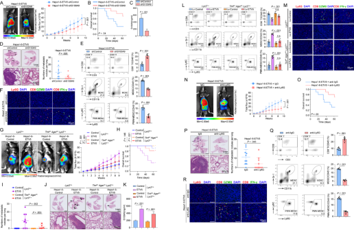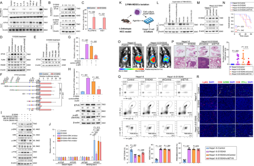 ChIP-seq和RNA-seq结果显示,ETV5在HCC细胞中与多个基因启动子结合,并影响其表达(图2 A-C)。ETV5直接结合CD274(编码PD-L1)和S100A9启动子,并促进其转录(图2 E-M)。ETV5过表达导致S100A9和PD-L1表达上调,而ETV5敲低则下调这些基因的表达(图2 F-G)。ELISA实验表明,ETV5过表达促进HCC细胞分泌S100A9(图2 I),增强了CD274和S100A9启动子的荧光素酶活性 (图2J)。序列分析和突变分析表明,ETV5结合位点1对于ETV5诱导的CD274和S100A9启动子激活至关重要 (图2K-L, 图S4和S5)。ChIP实验证实了ETV5与CD274和S100A9启动子区域的直接相互作用 (图2M-N)。