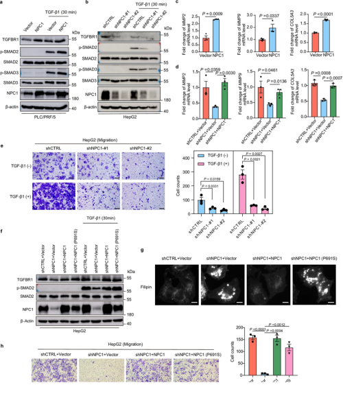 值得注意的是,在敲降NPC1后,回补NPC1的P691S突变体(胆固醇转运活性缺失)仍能恢复TGFBR1和p-SMAD2的水平以及细胞迁移能力(图1),表明NPC1调控TGF-β通路的方式与其胆固醇转运功能无关。