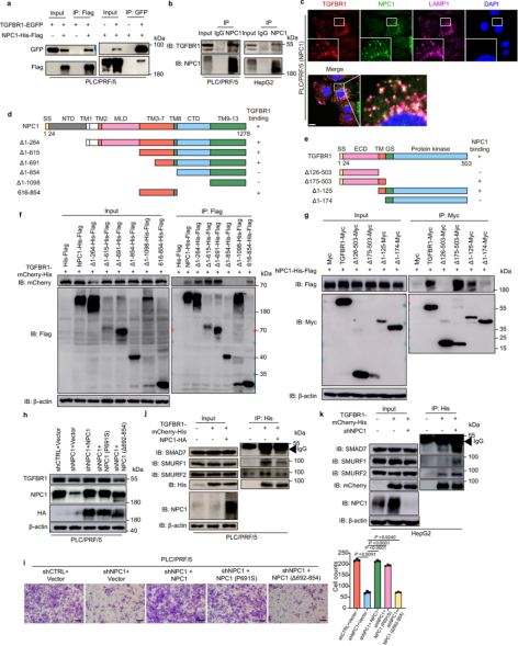 通过免疫共沉淀实验和细胞共定位分析,研究人员证实了NPC1与TGFBR1存在相互作用,且TGFBR1-NPC1复合物主要存在于溶酶体中(图2)。进一步分析表明,NPC1上的氨基酸692-854区域负责与TGFBR1结合。在稳定敲降NPC1的HCC细胞中,回补NPC1(P691S)可恢复TGFBR1表达和细胞迁移,但回补NPC1(Δ692-854)则无法挽救这些表型(图2)。