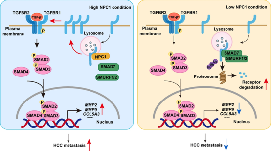 这项研究利用肝细胞中缺失Npc1的转基因小鼠模型,确定了NPC1在肝细胞癌中的促肿瘤作用。NPC1与TGFBR1相互作用,阻碍其与SMAD7/SMURF复合物的结合,进而减少TGFBR1的泛素化。通过稳定TGFBR1蛋白,NPC1调控了TGF-β信号通路,并促进了癌症的进展和转移(图3),而这与其在胆固醇转运中的作用无关。这些结果不仅揭示了HCC进展背后的分子机制,也表明NPC1有望成为HCC的预后标志物和治疗靶点。