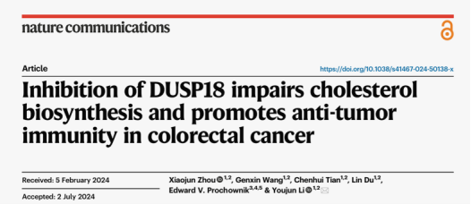 Zhou, X., Wang, G., Tian, C., Du, L., Prochownik, E.V., and Li, Y. (2024). Inhibition of DUSP18 impairs cholesterol biosynthesis and promotes anti-tumor immunity in colorectal cancer. Nature Communications 15, 5851. 10.1038/s41467-024-50138-x.