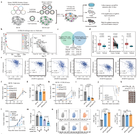 研究人员通过sgRNA文库筛选,并寻找与细胞毒性T淋巴细胞(CTL)评分负相关的交集基因,其中最值得注意的是Dusp18。与正常结直肠组织相比,CRC样本中DUSP18 mRNA的表达水平也较高。在DUSP18 mRNA低表达的CRC患者中,CTL评分高的患者生存率更高,而DUSP18 mRNA高表达且CTL评分高的患者生存率更低。为了确定抑制Dusp18是否会影响T细胞介导的抗肿瘤功能,研究人员在MC38 CRC细胞和表达卵清蛋白(OVA)的B16黑色素瘤(B16-OVA)细胞中进行shRNA介导的Dusp18抑制。敲低Dusp18并不影响肿瘤细胞在体外的增殖或肿瘤在免疫缺陷裸鼠体内的生长。然而,抑制Dusp18确实会影响免疫功能正常小鼠中肿瘤生长并延长其生存时间,而清除CD8+ T细胞则可以消除敲低Dusp18引起的肿瘤生长劣势。因此,上述结果表明,DUSP18通过CD8+ T细胞依赖的方式来促进CRC的免疫逃避。