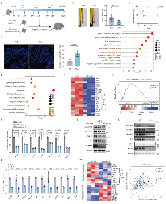 为了确定抑制DUSP18表达抗肿瘤免疫的分子机制,研究人员对shCtrl和shDusp18 MC38细胞进行RNA-seq分析。GO和KEGG分析显示,shDusp18细胞中下调的基因主要是参与胆固醇生物合成及其下游代谢途径。基因集富集分析(GSEA)也显示,与胆固醇稳态相关的基因在对照细胞中呈正富集。随后通过进一步证实,在shDusp18 MC38细胞和CKO(肠道上皮特异性DUSP18缺失的小鼠)肿瘤组织中(由赛业生物构建的小鼠),胆固醇生物合成基因的mRNA表达和蛋白水平下降。此外,研究人员还对shCtrl和shDUSP18人CRC HCT116细胞进行RNA-seq分析,以验证在小鼠MC38细胞中的结果。GO、KEGG和GSEA分析均显示,抑制DUSP18可显著降低胆固醇生物合成途径相关基因的表达。总之,上述研究结果都支持DUSP18通过调节细胞胆固醇的生物合成来调控肿瘤相关的免疫环境。