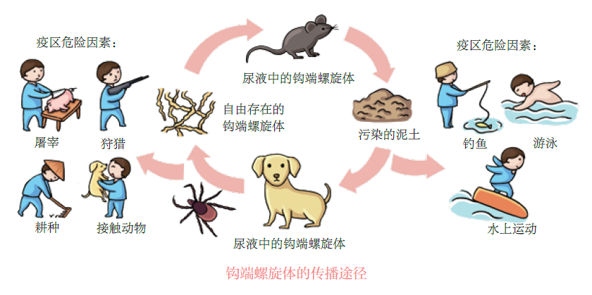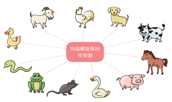 鼠类和猪是钩端螺旋体的两大主要传染源,南方及西南地区以鼠为主,北方和沿海平原以猪为主。狗、牛等也是重要的传染源,蛇、鸡、鸭、鹅、蛙、兔等动物也有可能感染钩端螺旋体。钩端螺旋体不易感染猫科动物。