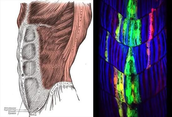 很遗憾,就连现代审美所追求的八块腹肌其实是进化过程中残留的产物。那种结缔组织分隔的肌肉特征是鱼类普遍拥有的,陆生脊索动物大部分肌肉已经失去了分节的现象,但在腹直肌上这种遗迹依旧存在。