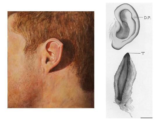 又例如人的耳朵,这是一个保存完好的进化遗址,出土文物之精美令人惊叹。首先是耳廓外沿残存的达尔文点,在耳轮后上部内缘有一个小突起。