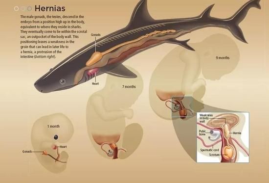 其原因就在于人类远祖们的性腺长在较高的位置,比如鲨鱼的性腺就长在肝脏附近。人类胚胎早期形成的性腺也依旧是这样,但我们都知道无论是女性的卵巢还是男性的睾丸,位置都要更靠下。因此,在胎儿发育的过程中,性腺是不断下移的,就像重演进化一样。对于女性来说卵巢只需要下移至下腹,而男性的睾丸则要下移至腹腔以外,这过程中难免出现差错。