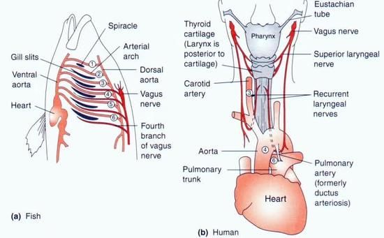 右侧的喉返神经要向下绕过颈动脉,而左侧的喉返神经更甚,向下延伸至心脏附近,绕过主动脉在返回喉部,这也就是喉返神经的名字由来。这种匪夷所思的布局又一次离不开我们的鱼类祖先。我们的喉返神经在祖先那里属于第四迷走神经分支,位于第六动脉弓之下,神经与动脉二者互不干扰。可到了陆生动物这里,第六动脉弓退移至胸部,而喉返神经还得乖乖地从它下方绕过,就形成了今天这个样子。
