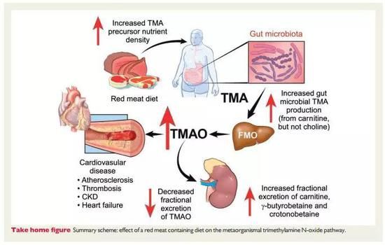 吃进去的红肉通过肠道微生物的作用生成TMAO,进而影响心血管健康,并降低肾脏的排出 来源:European Heart Journal