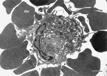 图:对非洲猪瘟病毒马拉维分离株感染的肺泡巨噬细胞的血液吸收。红细胞(rbc)粘附在感染细胞的表面,产生经典的莲座丛。病毒结构包括在组装的各个阶段含有病毒颗粒的核周病毒工厂(vf)和在通过出芽离开细胞之前的细胞质病毒(箭头)。细胞核(n)。条形代表5μm。(图源:SM Brookes)