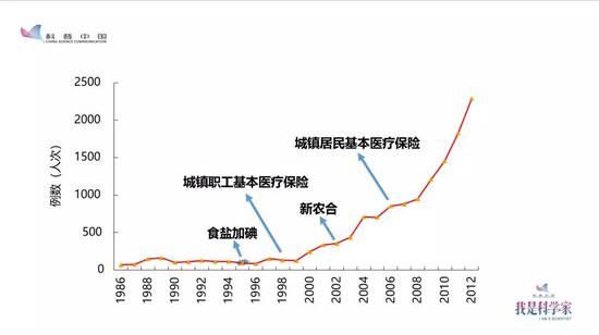那么混杂因素在哪呢?比方说有医保政策,过去看不起病的人可以进医院了。以前很多人到了医院做完诊断,拿到单子之后,他不拿药,他也不去做手术,他也不做正规治疗,为什么?因为太贵了。现在有了很好的医保,看不起病的人都去了医院。所以你可以看到一个现象,三甲医院的几乎所有科室都是人满为患。但是医院病人多都是碘盐的原因吗?不是,那是因为医保。这只是混杂因素的一个,还有很多混杂因素。