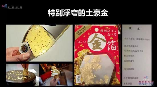 中间这个图片是我在日本的超市里看到的很小的一个包装,里面是金箔,可食用的。比如说你在家里过生日想在蛋糕上面弄点金箔,就可以用这个,合人民币大概十二块钱,很便宜的。右边这个图片是习近平总书记和马英九在新加坡会面的时候,他们的菜单第一道菜就叫做“金箔片皮猪”。