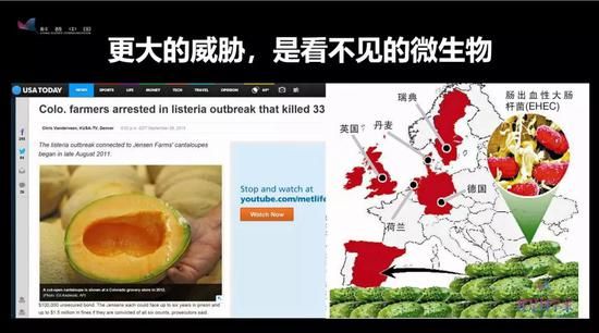 左边这个图是美国的甜瓜被李斯特菌感染,死亡34人的新闻,右边这个是德国的黄瓜或者是葫芦巴的种子被致病性大肠杆菌污染,死亡50多人的新闻。李斯特菌是致病性菌,如果是孕妇感染李斯特菌,那么会有50%的概率造成胎儿流产或者死胎。此外,因为李斯特菌的潜伏期可以长达一个月,也就是说当一个年轻女性流产之后,她可能想不到原来流产的原因是一个月前吃了一个被李斯特菌污染的食物,比如说三明治。她会想什么呢?我昨天吃啥了,是不是食物相克了?其实不是的。