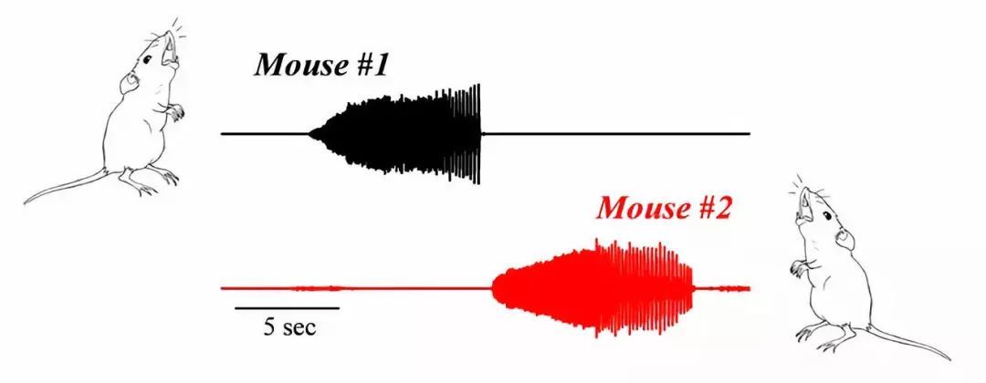 两只小鼠相互轮流对唱,图中显示的是在实验中观察到的波形示意图的例子。图片来源:Long Lab