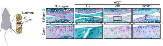 研究人员通过切断小鼠前交叉韧带建立了骨关节炎的体内模型。随后,以慢病毒载体为基因导入媒介,将编码YAP或FOXD1蛋白的慢病毒注射到患有骨关节炎的小鼠关节腔内。研究发现数周的YAP或FOXD1基因治疗均可显著降低关节软骨中衰老细胞比例,有效抑制关节软骨退化及关节腔炎症,从多个方面改善骨关节炎的病理表型。