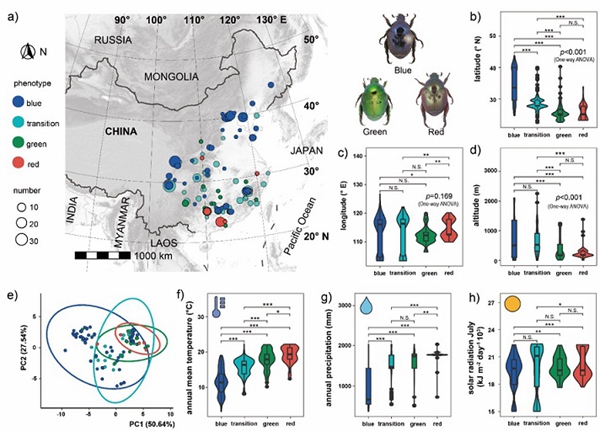 2025年8月4日,中国科学院动物研究所白明研究员团队与德国基尔大学Stanislav N. Gorb院士团队合作,在Nature集团杂志《Frontiers in Zoology》发表了题为“Structural background of intraspecific color polymorphism and the driver of geographic patterns in a shining leaf chafer”的研究论文。该研究以一种全国广布的常见甲虫:棉花弧丽金龟Popillia mutans(鞘翅目:金龟科:丽金龟亚科)为对象,首次系统阐明了其种内颜色多态性的物理化学机制,结合地理分布格局的可能驱动因子,设计实验论证了不同色型的力学性能与热调节功能差异,为理解生物如何适应环境变化提供了关键线索。