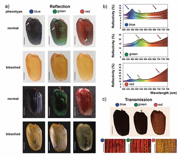 图2 棉花弧丽金龟三种色型(蓝色、绿色和红色)的光学特性。a)三种色型鞘翅在褪色前后不同背景下的反射特性。b)可见光谱范围(波长 380 - 780 纳米)内鞘翅的反射光谱。c)三种色型鞘翅在光学显微镜下的透射特性。