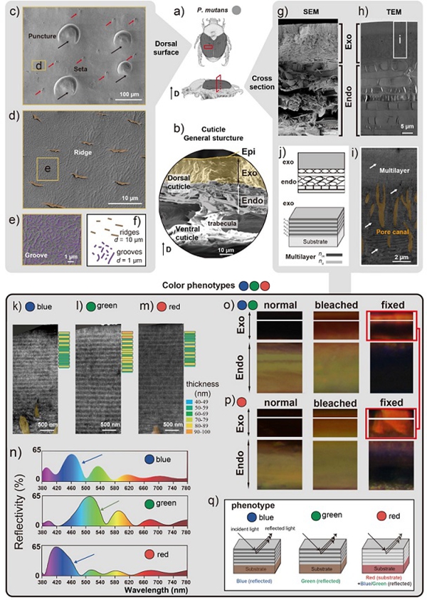 图3 棉花弧丽金龟的微观结构特征。a)背面观与侧面观。b)鞘翅横截面的扫描电子显微镜(SEM)图像。c-e)不同放大倍数下鞘翅表面的SEM图像。f)表面脊状物和沟槽的示意图。g)鞘翅外表皮和内表皮横截面的SEM图像。h)外表皮(i)和内表皮的透射电子显微镜(TEM)图像。j)表皮结构的模型。(k-m)蓝色型、绿色型、红色型外表皮的深浅亚层。n)基于前 20 层外表皮结构构建的多层膜仿真模拟反射光谱。o-p)正常、漂白处理和化学固定处理后的鞘翅横截面的自发荧光图像。