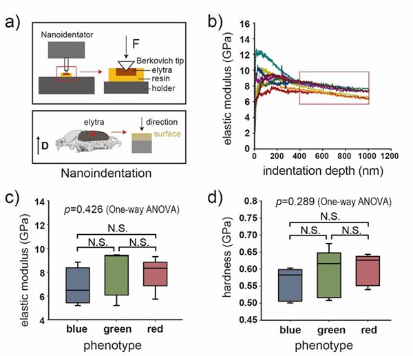 图4 棉花弧丽金龟鞘翅角质层的力学性能。a)使用纳米压痕法对鞘翅角质层进行力学特性测试的方法示意图。b)通过连续刚度测量(CSM)获得的弹性模量与压痕深度的关系。三种色型的鞘翅弹性模量(c)和硬度(d)。