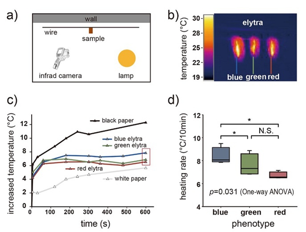 图5 三种色型鞘翅的热调节能力。a)实验装置。b)鞘翅表面温度分布的红外图像。c)蓝色型、绿色型和红色型鞘翅以及黑色和白色纸张在持续热源照射下的温度随时间变化情况。d)三种色型鞘翅的升温速率差异。