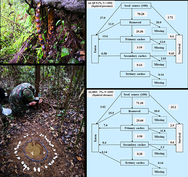 图2 啮齿动物对油麻藤种子的取食和传播(a, 松鼠存在区域;b, 松鼠缺失区域)