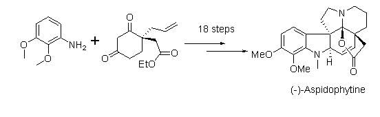 Aspidophytine属于Aspidosperma类生物碱的一种。由于结构新颖,引起了合成化学家的广泛兴趣。但直到1999年,哈佛大学的诺贝尔奖得主E. J. Corey才率先完成了其全合成,随后许多著名的学者也相继报道了其全合成。截至目前,已有四位著名学者完成了其不对称全合成,一位完成了消旋体的全合成,但是所有文献报道的合成路线都存在一定的局限性。
