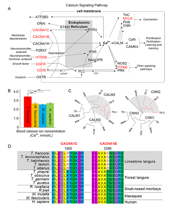中国科学院动物研究所灵长类生态学研究组与德国灵长类研究中心等国内外多家科研机构合作,利用比较基因组、种群基因组及其细胞学功能实验,揭示了乌叶猴属中的石山叶猴种组物种适应喀斯特特殊生境的遗传机制,发现石山叶猴的钙离子通道蛋白(CAV1.2)具有有效减少钙离子内流的作用,从而保证了石山叶猴物种在高钙环境中的正常生活。