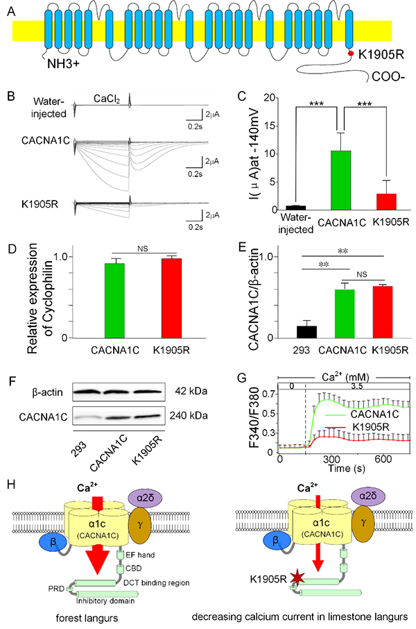 该研究基于对乌叶猴属9个物种23个个体全基因组重测序分析,重建演化历史和种群结构,揭示乌叶猴属中黑叶猴种组、银叶猴种组(T. cristatus group)、郁乌叶猴种组(T. obscurus group)三个种组演化地位和种群动态。结果表明乌叶猴属祖先在历史上约2.9个百万年前分化形成石山叶猴(Limestone langur)和雨林叶猴(Forest langurs)两大类群,而黑叶猴种组黑叶猴(T. francoisi)、白头叶猴(T. leucocephalus)、老挝乌叶猴(T. laotum)、印支乌叶猴(T. ebenus)和越南乌叶猴(T. hatinhensis)的祖先约在1.1个百万年前开始分化。石山叶猴类群内正选择基因富集于“钙离子信号代谢”等通路,并发现了一系列与钙离子信号传导、钙离子跨膜转运以及细胞内钙离子调控相关的正选择基因和扩张基因家族(图1)。通过对位于细胞膜上的电压门控钙离子通道蛋白(CAV1.2)的点突变细胞钙离子成像实验和全细胞膜片钳实验,结果显示相比于祖先基因型,黑叶猴基因型的CAV1.2通道具有有效减少钙离子内流的作用。研究提示该基因的点突变可能是石山叶猴适应喀斯特环境的机制之一(图2)。黑叶猴与白头叶猴除毛色差异外,生存环境和习性极其相似,基于种群基因组学的选择消除分析提示在白头叶猴中,黑色素合成信号通路相关基因受到显著的正选择,且转录组分析揭示黑色素合成信号通路中的关键基因EDNRB在白头叶猴中的表达量远低于黑叶猴。因此本研究推断EDNRB基因是在自然选择过程中,在白头叶猴遗留下来的环境适应性毛色表型的关键机制。该研究首次从基因组和细胞学水平对生活于喀斯特极端环境中的非人灵长类的适应性机制进行了研究,该研究结果将为其它生活于该环境的适应机制的探讨提供借鉴,同时也可能对探讨相同环境下不同物种的趋同性适应进化研究提供研究思路。