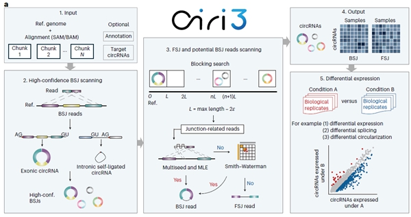 环形RNA因其独特的共价闭合环状结构,能够有效抵抗细胞内核酸外切酶的降解,展现出远高于线性RNA的稳定性,不仅成为基因调控与疾病机制研究的前沿热点,也作为多种重大疾病的生物标志物与潜在治疗靶点而备受关注。然而,现有环形RNA识别与定量算法流程复杂、资源消耗巨大,且在识别精度和灵敏度方面仍存在不足,难以实现大规模数据中低丰度及非典型环形RNA的高效检测,极大制约了基于现有海量转录组测序数据集的环形RNA研究的系统开展。