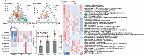 (a & b)肠道微生物组成和功能差异;(c) 粪便中短链脂肪酸的差异;(d)体重变化及粪便中L-组氨酸含量差异;(e)差异代谢功能的具体列表。