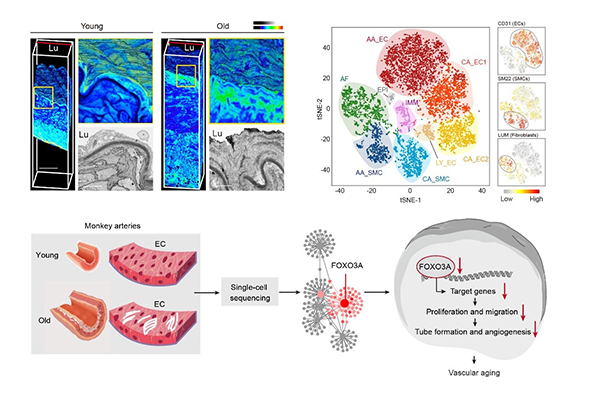 2020年5月5日,中国科学院动物研究所曲静研究组、刘光慧研究组与北京大学汤富酬研究组合作在Nature Communications杂志在线发表题为“A single-cell transcriptomic landscape of primate arterial aging”的研究论文。该研究以食蟹猴为研究对象,首次绘制了灵长类动脉血管衰老的单细胞基因表达图谱,进而揭示长寿基因FOXO3A的表达下调是血管衰老的驱动力。