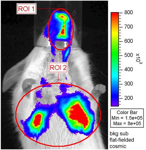 小鼠经鼻感染“荧光流感病毒”,2天后用成像仪在病毒感染区域,即鼻咽和肺部可检测到病毒引起的发光。