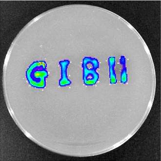 用“荧光流感病毒”在培养皿上的单层细胞上写GIBH(Guangzhou Institutes of Biomedicine and Health)字样,一天后加入底物培养皿上病毒感染的细胞即显示出发光的GIBH。