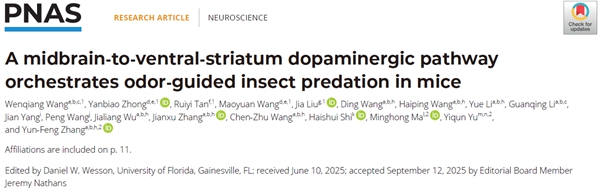 2025年10月10日,中国科学院动物研究所张云峰研究员团队在国际权威期刊《美国国家科学院院刊》(PNAS)上发表题为“A midbrain-to-ventral-striatum dopaminergic pathway orchestrates odor-guided insect predation in mice”文章。该研究首次在分子、细胞与神经环路层面系统揭示了小鼠如何通过敏锐的嗅觉系统判断猎物的营养状态,并做出精准捕食决策的神经编码机制。