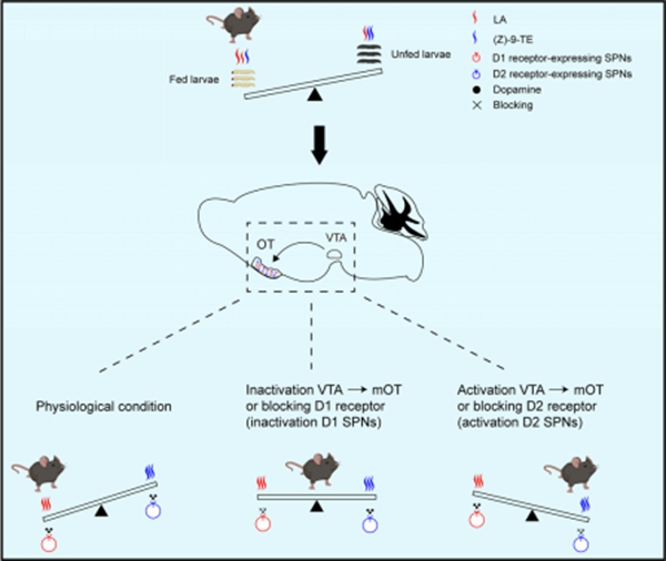 在自然环境中,动物常常需要依赖气味来评估食物的营养价值。为了深入探索这一行为背后的神经基础,研究团队构建了一套模拟自然捕食的行为实验系统,以棉铃虫幼虫为研究对象展开实验。令人惊讶的是,无论处于空腹还是饱腹状态,小鼠都显著倾向于捕食“已进食”的幼虫,而这一行为高度依赖于其主嗅觉系统的完整功能。研究团队运用气相色谱-质谱联用技术,从幼虫体表挥发物中精准鉴定出两种关键化学信号:在正常进食幼虫体表含量较高的亚油酸(LA),以及在饥饿幼虫体表显著富集的(Z)-9-二十三碳烯[(Z)-9-TE]。行为学实验进一步证实,LA对小鼠具有吸引作用,而(Z)-9-TE]则引发回避反应,且这两种效应均呈现浓度依赖性。进一步研究发现,起源于腹侧被盖区(VTA)、投射至内侧嗅结节(mOT)的多巴胺神经通路,是调控气味偏好的核心枢纽。通过化学遗传学技术精准调控该通路活性,研究人员成功实现了对小鼠行为选择的双向操控:抑制通路会削弱小鼠对LA的偏好,而激活通路则能让小鼠转而偏好原本回避的(Z)-9-TE。在细胞机制层面,研究团队借助光纤记录技术发现,mOT区的D1型和D2型多棘投射神经元分别对LA和(Z)-9-TE表现出特异性反应。药理学实验证实,D1受体介导了对LA的趋近行为,而D2受体则参与了对(Z)-9-TE的回避反应,二者形成了一种精妙的“跷跷板”式平衡调控机制(图1)。值得一提的是,LA和(Z)-9-TE诱发的表型在布氏田鼠和褐家鼠等野生啮齿类动物中同样存在,提示此两种化合物的生物学效应可能具有跨物种的保守性。
